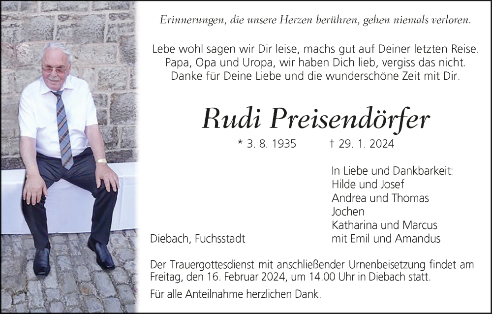 Hier finden Sie alle Traueranzeigen aus der Zeitung, die bisher für Rudi Preisendörfer erschienen sind. Weitere Traueranzeigen, die in der Zeitung erscheinen, werden hier ebenfalls aufgelistet