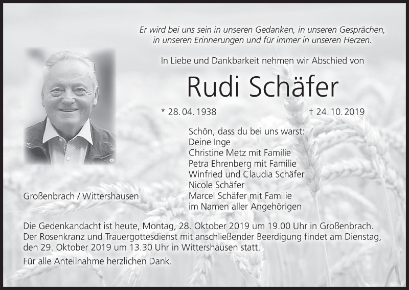 Hier finden Sie alle Traueranzeigen aus der Zeitung, die bisher für Rudi Schäfer erschienen sind. Weitere Traueranzeigen, die in der Zeitung erscheinen, werden hier ebenfalls aufgelistet