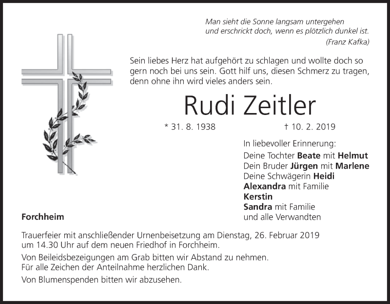 Hier finden Sie alle Traueranzeigen aus der Zeitung, die bisher für Rudi Zeltler erschienen sind. Weitere Traueranzeigen, die in der Zeitung erscheinen, werden hier ebenfalls aufgelistet