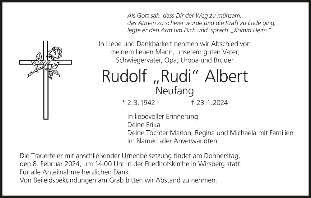 Hier finden Sie alle Traueranzeigen aus der Zeitung, die bisher für Rudolf Albert erschienen sind. Weitere Traueranzeigen, die in der Zeitung erscheinen, werden hier ebenfalls aufgelistet