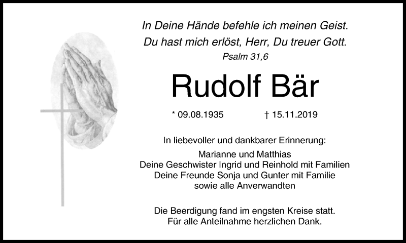 Hier finden Sie alle Traueranzeigen aus der Zeitung, die bisher für Rudolf Bär erschienen sind. Weitere Traueranzeigen, die in der Zeitung erscheinen, werden hier ebenfalls aufgelistet