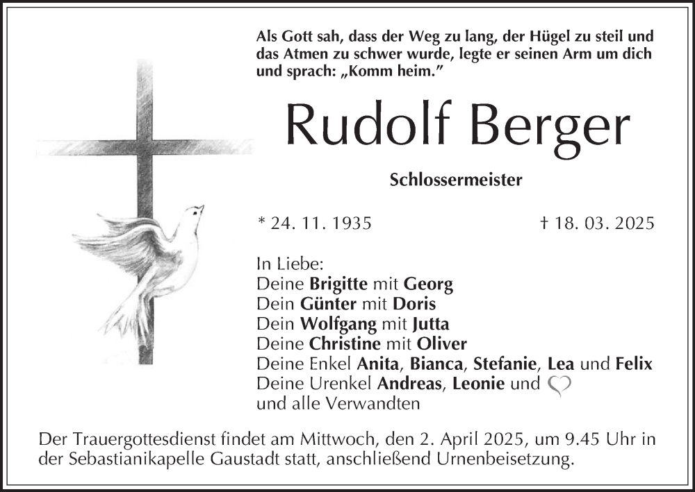 Hier finden Sie alle Traueranzeigen aus der Zeitung, die bisher für Rudolf Berger erschienen sind. Weitere Traueranzeigen, die in der Zeitung erscheinen, werden hier ebenfalls aufgelistet