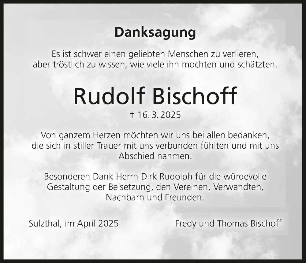 Hier finden Sie alle Traueranzeigen aus der Zeitung, die bisher für Rudolf Bischoff erschienen sind. Weitere Traueranzeigen, die in der Zeitung erscheinen, werden hier ebenfalls aufgelistet
