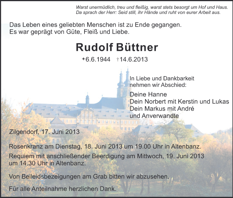 Hier finden Sie alle Traueranzeigen aus der Zeitung, die bisher für Rudolf Büttner erschienen sind. Weitere Traueranzeigen, die in der Zeitung erscheinen, werden hier ebenfalls aufgelistet