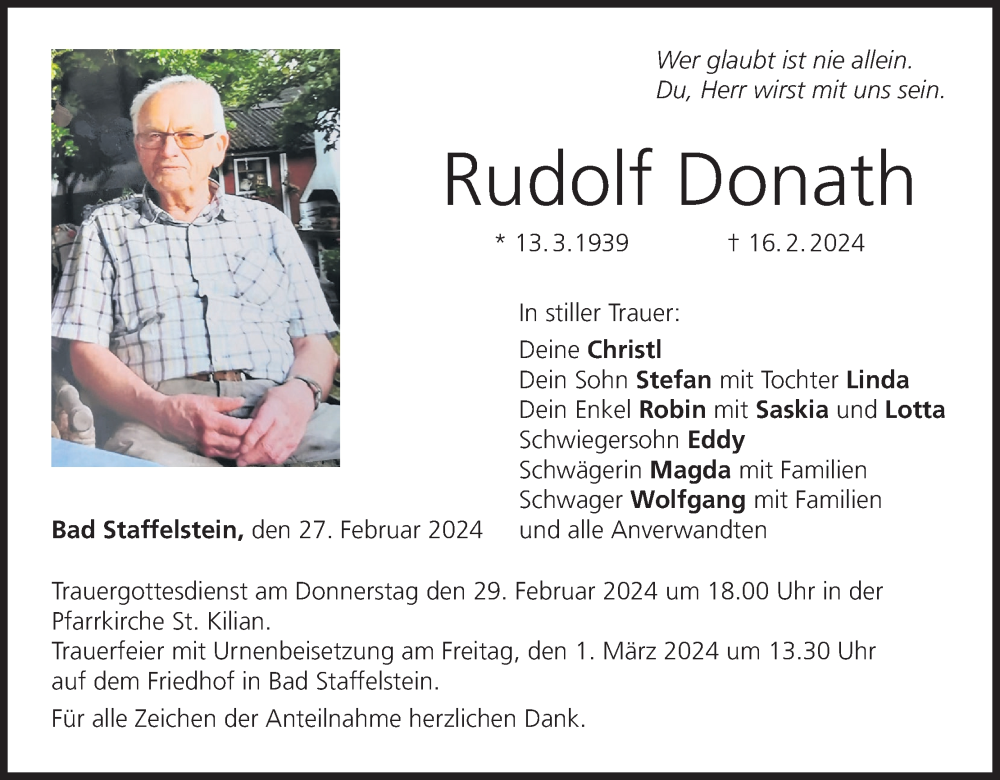 Hier finden Sie alle Traueranzeigen aus der Zeitung, die bisher für Rudolf Donath erschienen sind. Weitere Traueranzeigen, die in der Zeitung erscheinen, werden hier ebenfalls aufgelistet