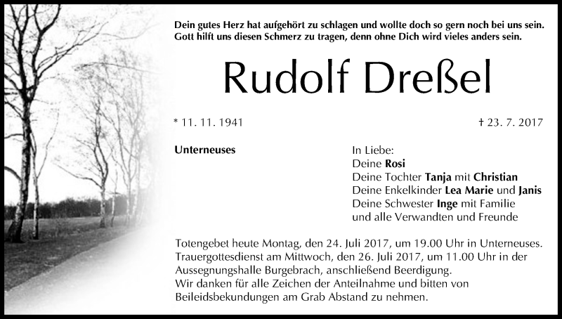 Hier finden Sie alle Traueranzeigen aus der Zeitung, die bisher für Rudolf Dreßel erschienen sind. Weitere Traueranzeigen, die in der Zeitung erscheinen, werden hier ebenfalls aufgelistet