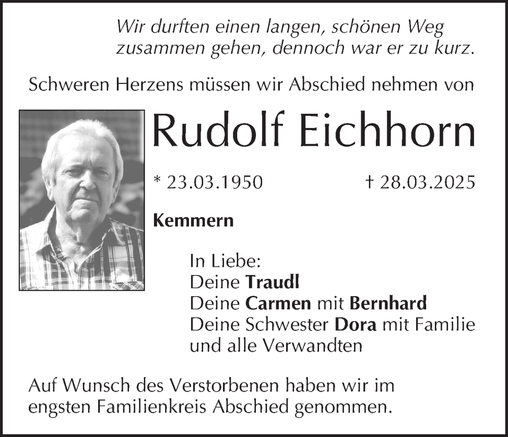 Hier finden Sie alle Traueranzeigen aus der Zeitung, die bisher für Rudolf Eichhorn erschienen sind. Weitere Traueranzeigen, die in der Zeitung erscheinen, werden hier ebenfalls aufgelistet