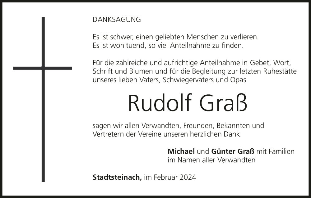 Hier finden Sie alle Traueranzeigen aus der Zeitung, die bisher für Rudolf Graß erschienen sind. Weitere Traueranzeigen, die in der Zeitung erscheinen, werden hier ebenfalls aufgelistet