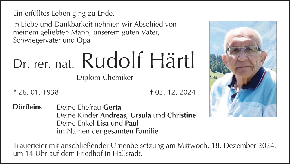 Hier finden Sie alle Traueranzeigen aus der Zeitung, die bisher für Rudolf Härtl erschienen sind. Weitere Traueranzeigen, die in der Zeitung erscheinen, werden hier ebenfalls aufgelistet