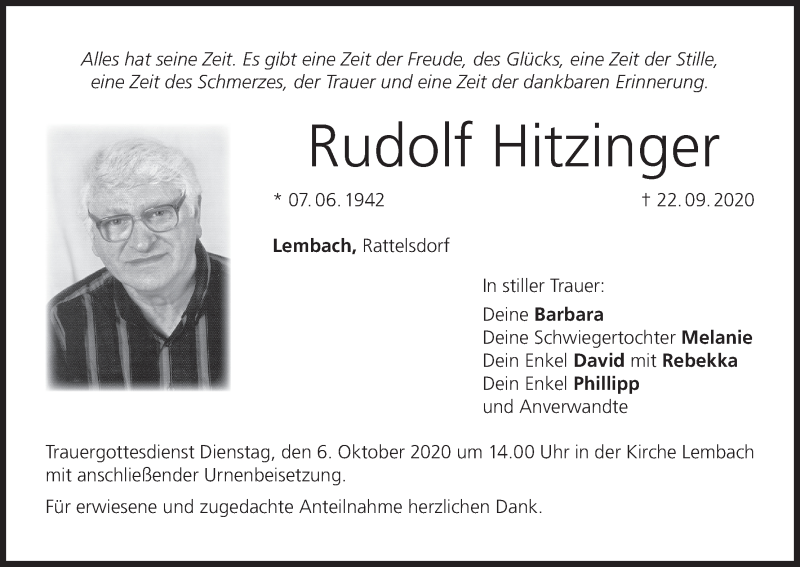 Hier finden Sie alle Traueranzeigen aus der Zeitung, die bisher für Rudolf Hitzinger erschienen sind. Weitere Traueranzeigen, die in der Zeitung erscheinen, werden hier ebenfalls aufgelistet