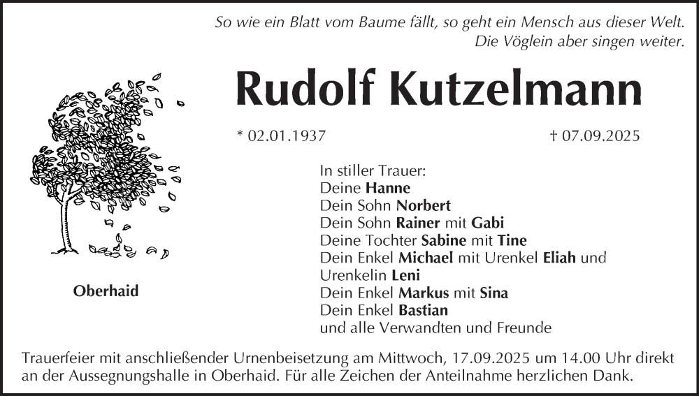 Hier finden Sie alle Traueranzeigen aus der Zeitung, die bisher für Rudolf Kutzelmann erschienen sind. Weitere Traueranzeigen, die in der Zeitung erscheinen, werden hier ebenfalls aufgelistet
