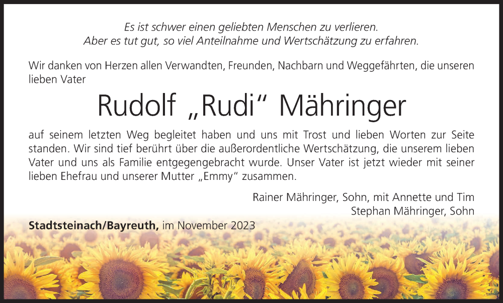 Hier finden Sie alle Traueranzeigen aus der Zeitung, die bisher für Rudolf Mähringer erschienen sind. Weitere Traueranzeigen, die in der Zeitung erscheinen, werden hier ebenfalls aufgelistet