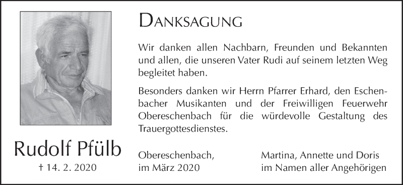 Hier finden Sie alle Traueranzeigen aus der Zeitung, die bisher für Rudolf Pfülb erschienen sind. Weitere Traueranzeigen, die in der Zeitung erscheinen, werden hier ebenfalls aufgelistet