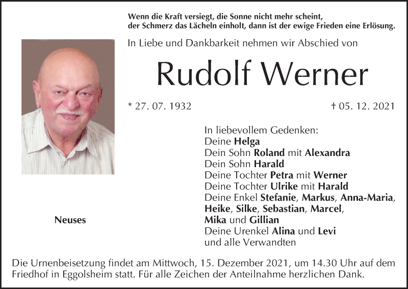 Hier finden Sie alle Traueranzeigen aus der Zeitung, die bisher für Rudolf Werner erschienen sind. Weitere Traueranzeigen, die in der Zeitung erscheinen, werden hier ebenfalls aufgelistet