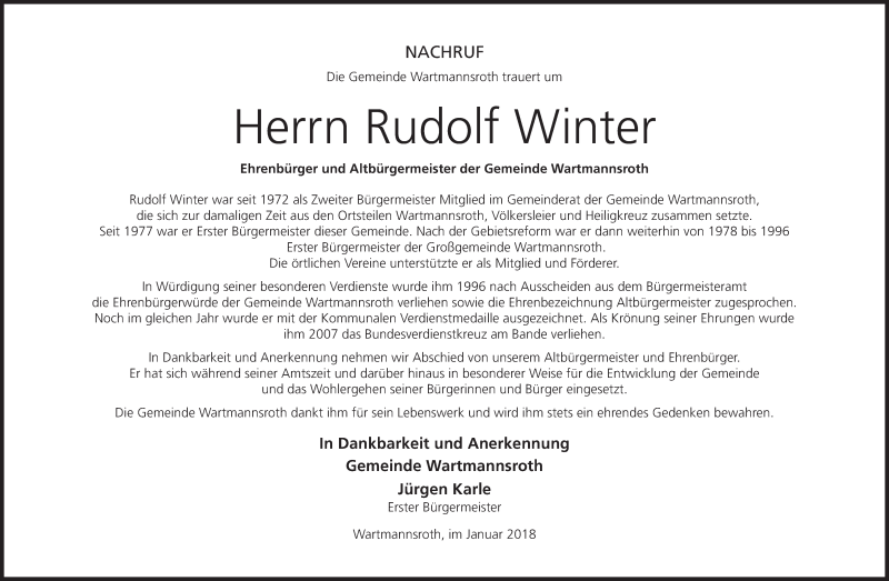 Hier finden Sie alle Traueranzeigen aus der Zeitung, die bisher für Rudolf Winter erschienen sind. Weitere Traueranzeigen, die in der Zeitung erscheinen, werden hier ebenfalls aufgelistet