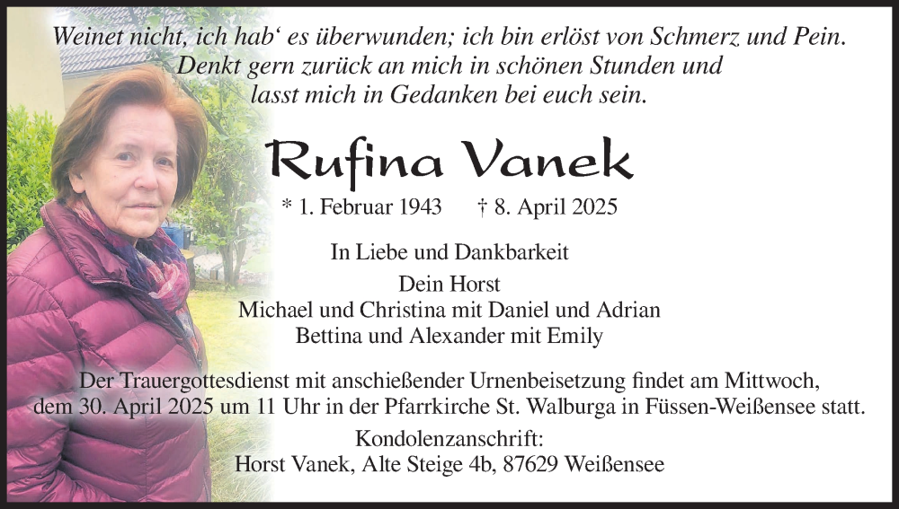 Hier finden Sie alle Traueranzeigen aus der Zeitung, die bisher für Rufina Vanek erschienen sind. Weitere Traueranzeigen, die in der Zeitung erscheinen, werden hier ebenfalls aufgelistet