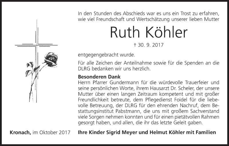 Hier finden Sie alle Traueranzeigen aus der Zeitung, die bisher für Ruth Köhler erschienen sind. Weitere Traueranzeigen, die in der Zeitung erscheinen, werden hier ebenfalls aufgelistet