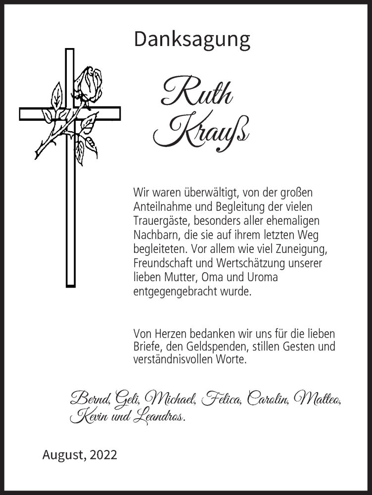Hier finden Sie alle Traueranzeigen aus der Zeitung, die bisher für Ruth Krauß erschienen sind. Weitere Traueranzeigen, die in der Zeitung erscheinen, werden hier ebenfalls aufgelistet