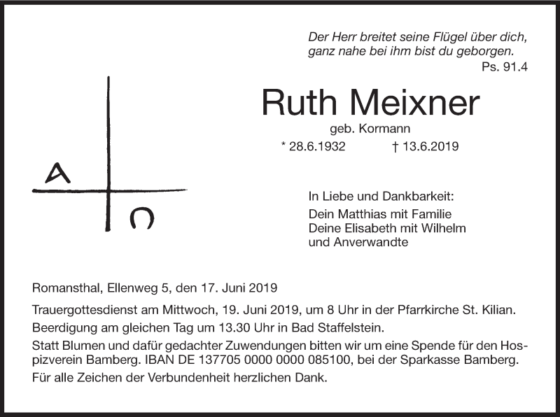 Hier finden Sie alle Traueranzeigen aus der Zeitung, die bisher für Ruth Meixner erschienen sind. Weitere Traueranzeigen, die in der Zeitung erscheinen, werden hier ebenfalls aufgelistet
