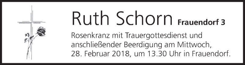 Hier finden Sie alle Traueranzeigen aus der Zeitung, die bisher für Ruth Schorn erschienen sind. Weitere Traueranzeigen, die in der Zeitung erscheinen, werden hier ebenfalls aufgelistet