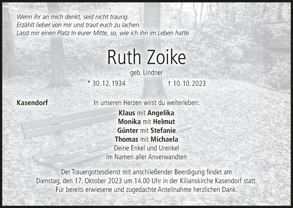 Hier finden Sie alle Traueranzeigen aus der Zeitung, die bisher für Ruth Zoike erschienen sind. Weitere Traueranzeigen, die in der Zeitung erscheinen, werden hier ebenfalls aufgelistet