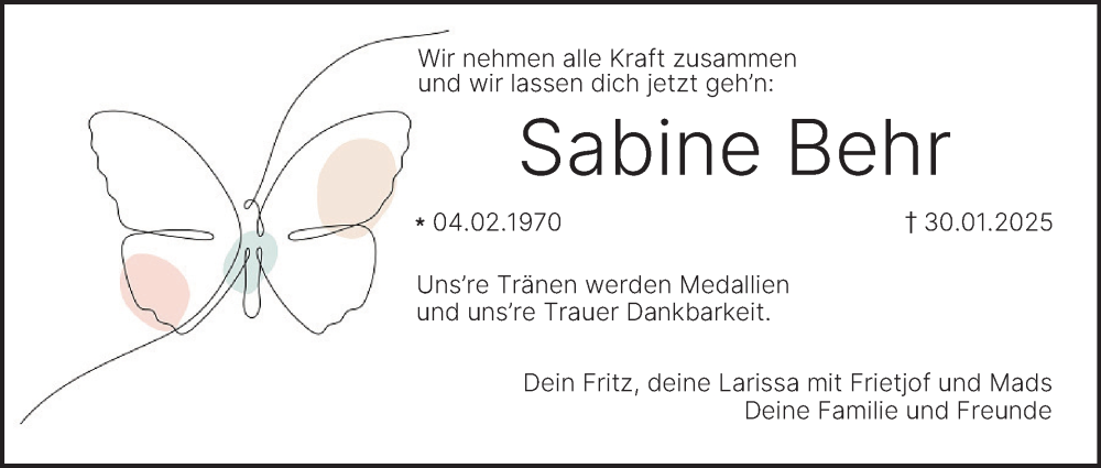 Hier finden Sie alle Traueranzeigen aus der Zeitung, die bisher für Sabine Behr erschienen sind. Weitere Traueranzeigen, die in der Zeitung erscheinen, werden hier ebenfalls aufgelistet