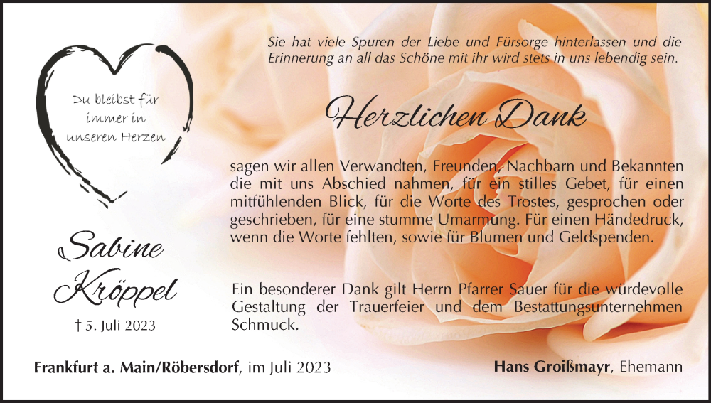 Hier finden Sie alle Traueranzeigen aus der Zeitung, die bisher für Sabine Kröppel erschienen sind. Weitere Traueranzeigen, die in der Zeitung erscheinen, werden hier ebenfalls aufgelistet