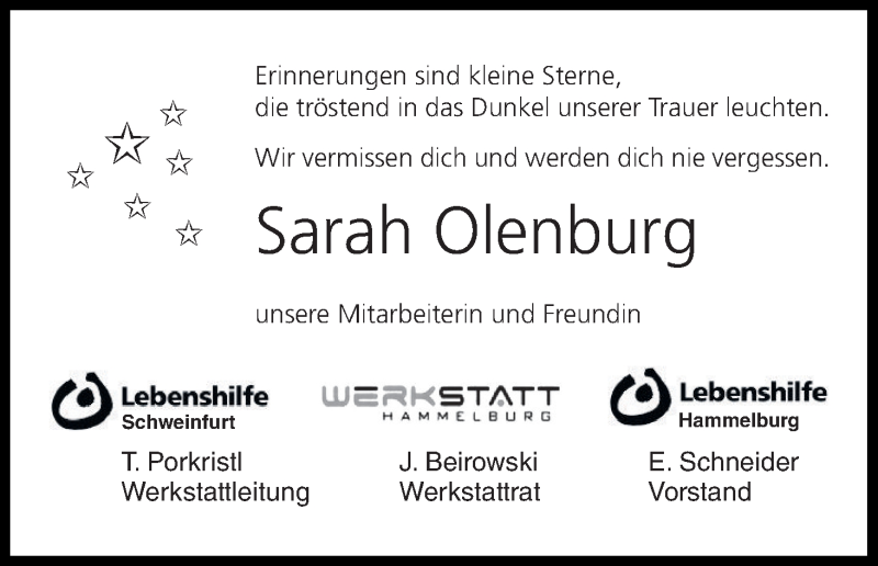 Hier finden Sie alle Traueranzeigen aus der Zeitung, die bisher für Sarah Olenburg erschienen sind. Weitere Traueranzeigen, die in der Zeitung erscheinen, werden hier ebenfalls aufgelistet