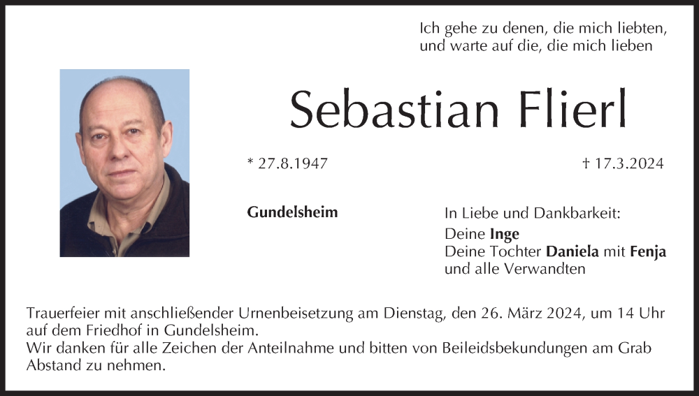 Hier finden Sie alle Traueranzeigen aus der Zeitung, die bisher für Sebastian Flierl erschienen sind. Weitere Traueranzeigen, die in der Zeitung erscheinen, werden hier ebenfalls aufgelistet