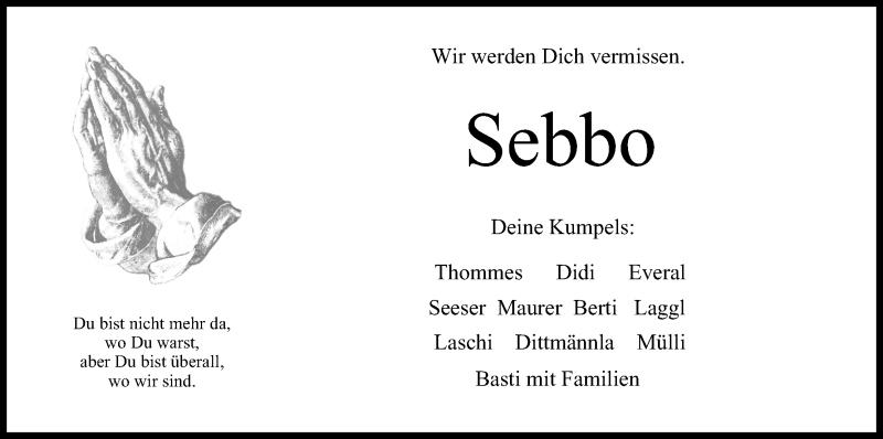 Hier finden Sie alle Traueranzeigen aus der Zeitung, die bisher für Sebastian Müller erschienen sind. Weitere Traueranzeigen, die in der Zeitung erscheinen, werden hier ebenfalls aufgelistet