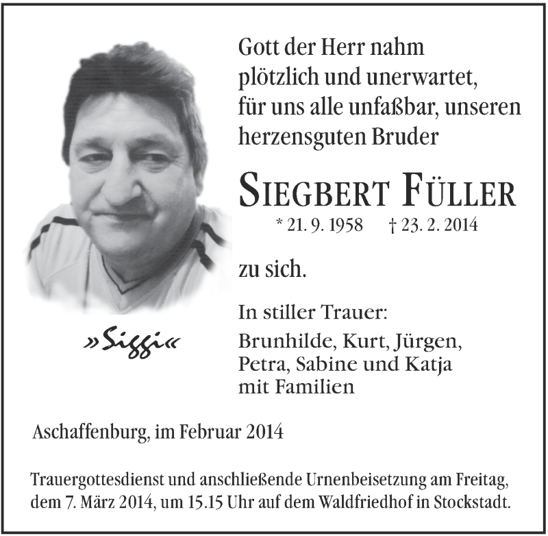 Hier finden Sie alle Traueranzeigen aus der Zeitung, die bisher für Siegbert Füller erschienen sind. Weitere Traueranzeigen, die in der Zeitung erscheinen, werden hier ebenfalls aufgelistet