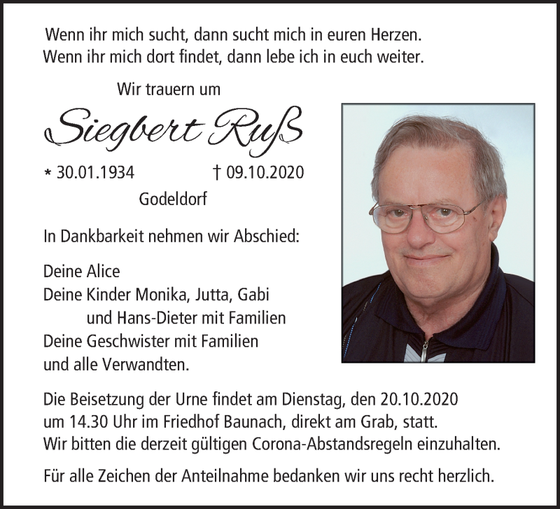 Hier finden Sie alle Traueranzeigen aus der Zeitung, die bisher für Siegbert Ruß erschienen sind. Weitere Traueranzeigen, die in der Zeitung erscheinen, werden hier ebenfalls aufgelistet