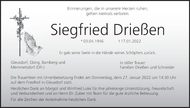 Hier finden Sie alle Traueranzeigen aus der Zeitung, die bisher für Siegfried Drießen erschienen sind. Weitere Traueranzeigen, die in der Zeitung erscheinen, werden hier ebenfalls aufgelistet