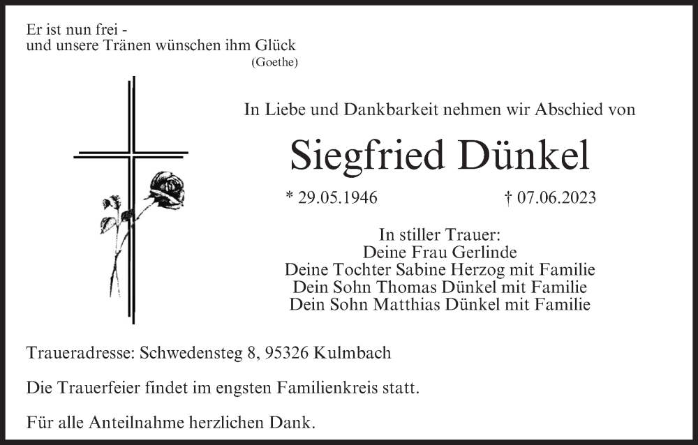 Hier finden Sie alle Traueranzeigen aus der Zeitung, die bisher für Siegfried Dünkel erschienen sind. Weitere Traueranzeigen, die in der Zeitung erscheinen, werden hier ebenfalls aufgelistet