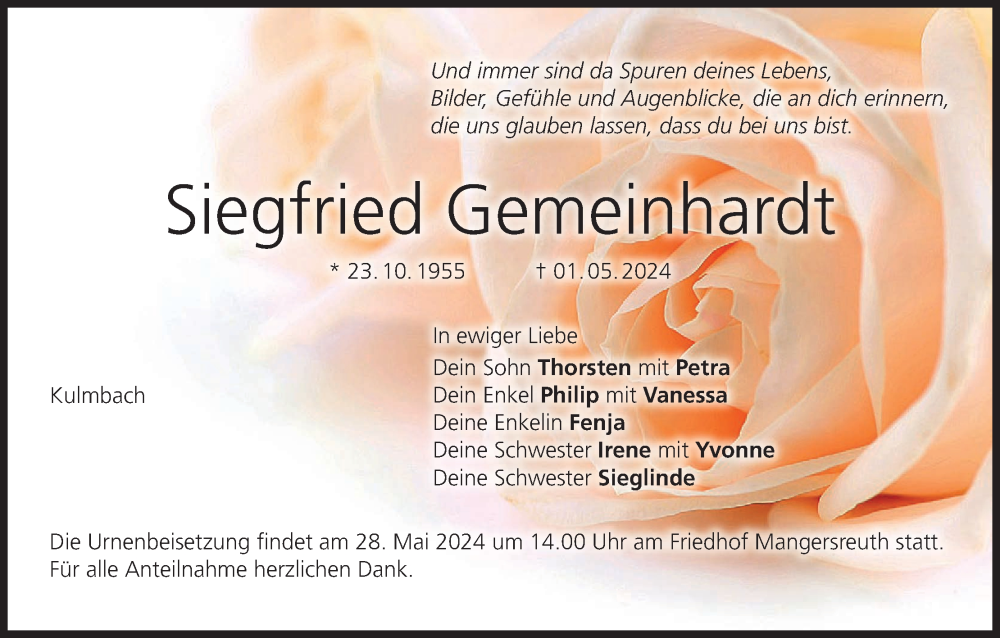 Hier finden Sie alle Traueranzeigen aus der Zeitung, die bisher für Siegfried Gemeinhardt erschienen sind. Weitere Traueranzeigen, die in der Zeitung erscheinen, werden hier ebenfalls aufgelistet