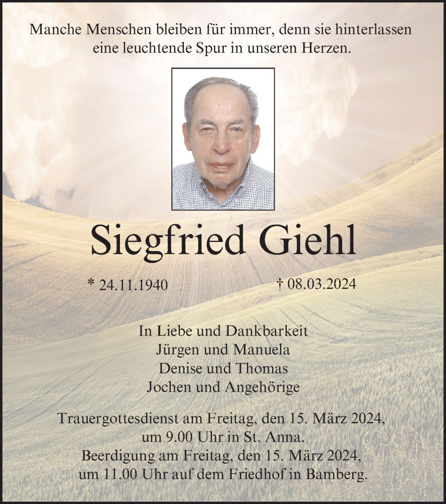 Hier finden Sie alle Traueranzeigen aus der Zeitung, die bisher für Siegfried Giehl erschienen sind. Weitere Traueranzeigen, die in der Zeitung erscheinen, werden hier ebenfalls aufgelistet