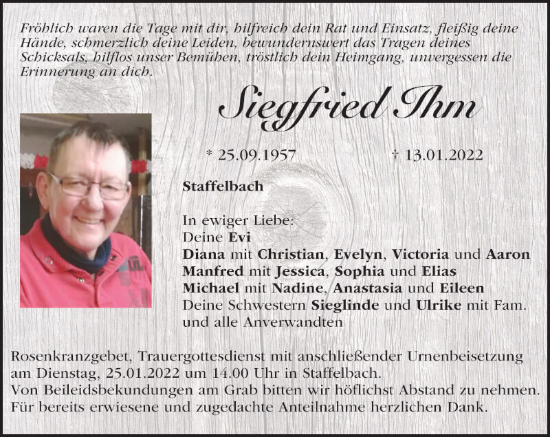 Hier finden Sie alle Traueranzeigen aus der Zeitung, die bisher für Siegfried Ihm erschienen sind. Weitere Traueranzeigen, die in der Zeitung erscheinen, werden hier ebenfalls aufgelistet