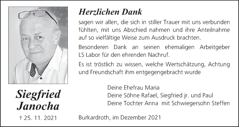 Hier finden Sie alle Traueranzeigen aus der Zeitung, die bisher für Siegfried Janocha erschienen sind. Weitere Traueranzeigen, die in der Zeitung erscheinen, werden hier ebenfalls aufgelistet