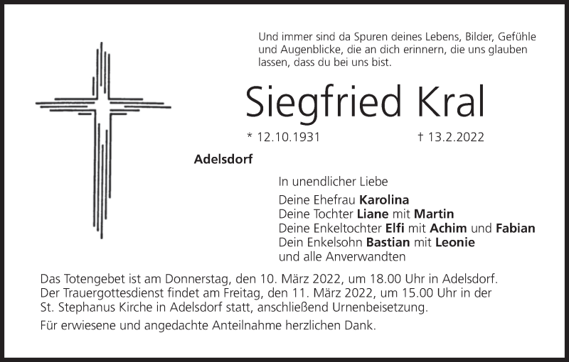 Hier finden Sie alle Traueranzeigen aus der Zeitung, die bisher für Siegfried Kral erschienen sind. Weitere Traueranzeigen, die in der Zeitung erscheinen, werden hier ebenfalls aufgelistet