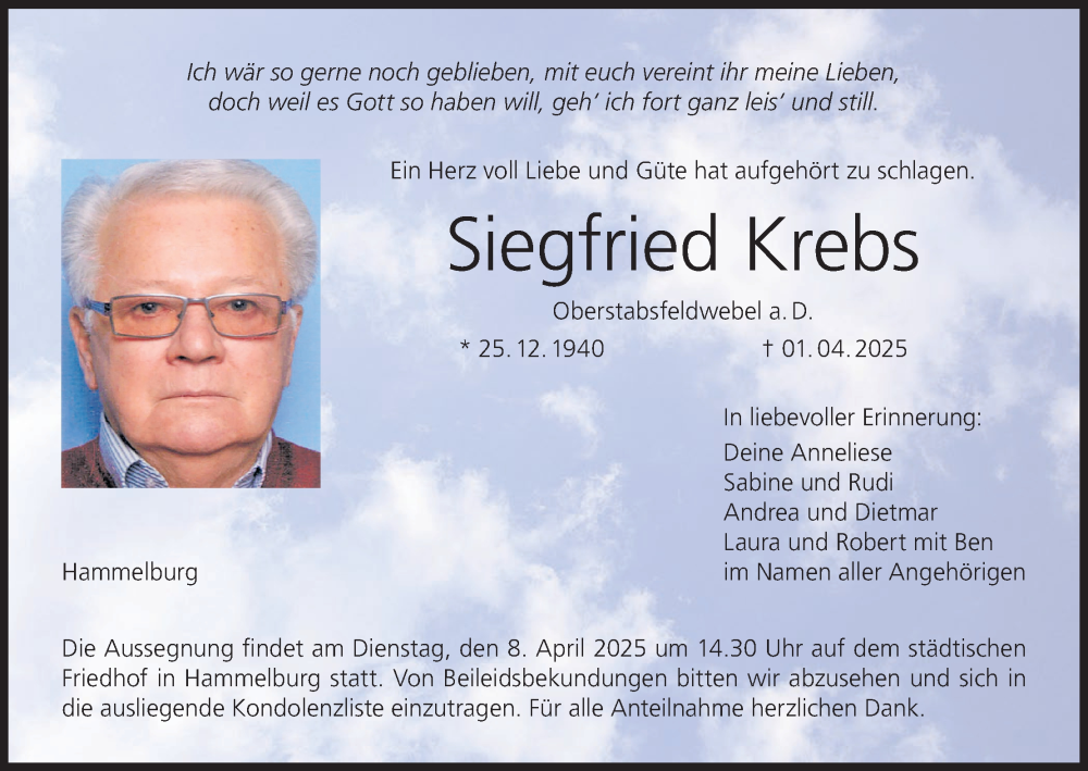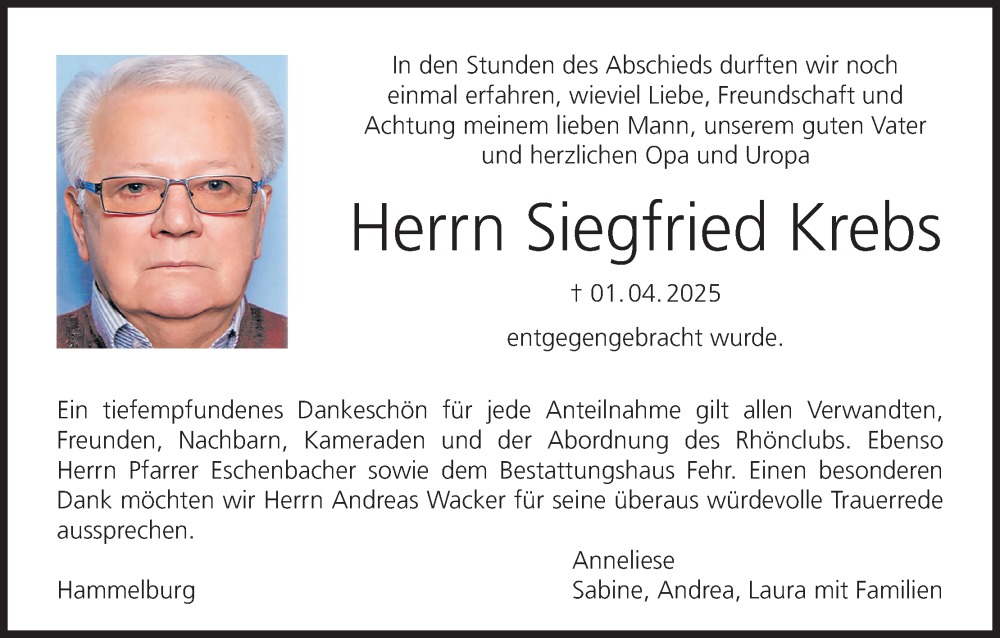 Hier finden Sie alle Traueranzeigen aus der Zeitung, die bisher für Siegfried Krebs erschienen sind. Weitere Traueranzeigen, die in der Zeitung erscheinen, werden hier ebenfalls aufgelistet