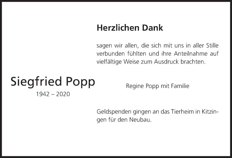 Hier finden Sie alle Traueranzeigen aus der Zeitung, die bisher für Siegfried Popp erschienen sind. Weitere Traueranzeigen, die in der Zeitung erscheinen, werden hier ebenfalls aufgelistet