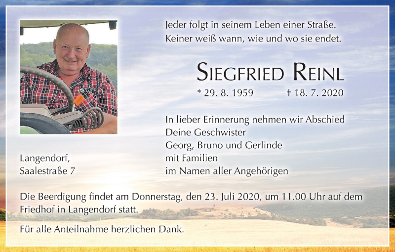 Hier finden Sie alle Traueranzeigen aus der Zeitung, die bisher für Siegfried Reinl erschienen sind. Weitere Traueranzeigen, die in der Zeitung erscheinen, werden hier ebenfalls aufgelistet