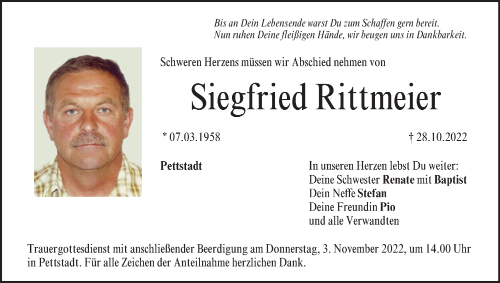 Hier finden Sie alle Traueranzeigen aus der Zeitung, die bisher für Siegfried Rittmeier erschienen sind. Weitere Traueranzeigen, die in der Zeitung erscheinen, werden hier ebenfalls aufgelistet
