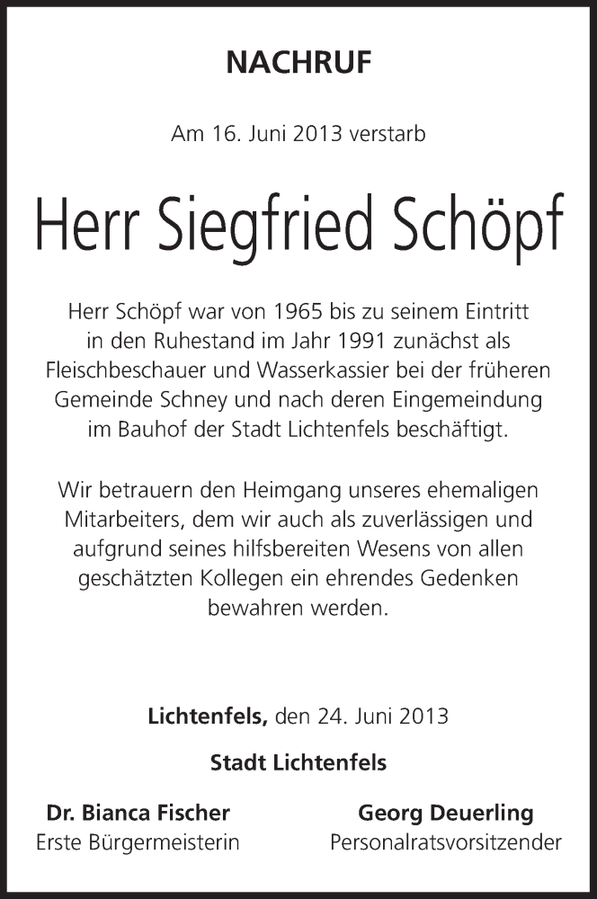 Hier finden Sie alle Traueranzeigen aus der Zeitung, die bisher für Siegfried Schöpf erschienen sind. Weitere Traueranzeigen, die in der Zeitung erscheinen, werden hier ebenfalls aufgelistet