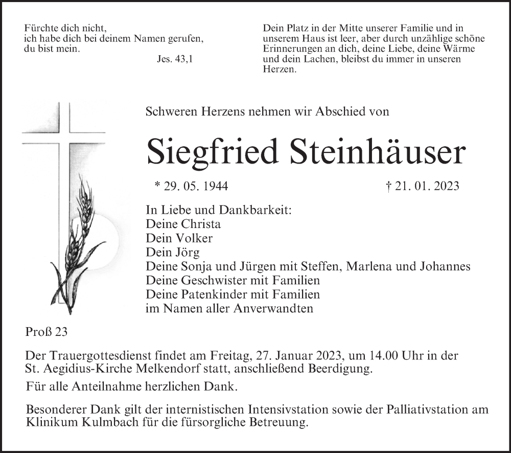 Hier finden Sie alle Traueranzeigen aus der Zeitung, die bisher für Siegfried Steinhäuser erschienen sind. Weitere Traueranzeigen, die in der Zeitung erscheinen, werden hier ebenfalls aufgelistet
