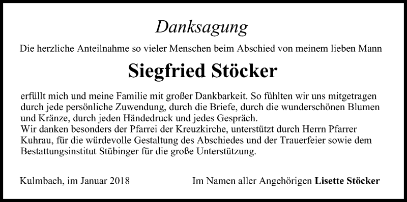 Hier finden Sie alle Traueranzeigen aus der Zeitung, die bisher für Siegfried Stöcker erschienen sind. Weitere Traueranzeigen, die in der Zeitung erscheinen, werden hier ebenfalls aufgelistet