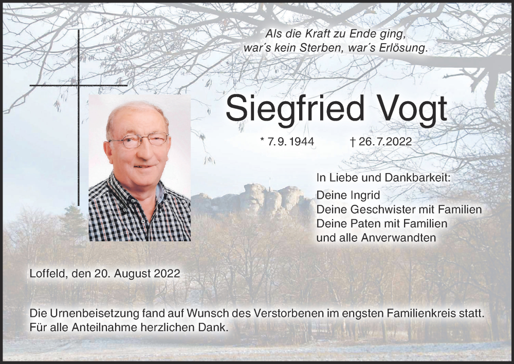 Hier finden Sie alle Traueranzeigen aus der Zeitung, die bisher für Siegfried Vogt erschienen sind. Weitere Traueranzeigen, die in der Zeitung erscheinen, werden hier ebenfalls aufgelistet