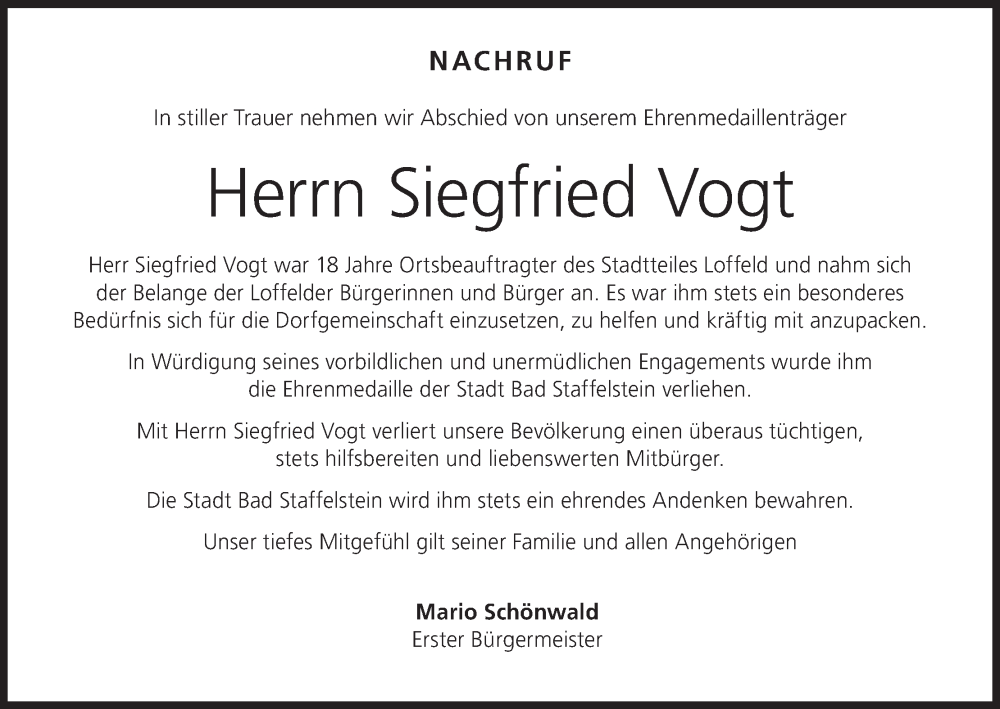 Hier finden Sie alle Traueranzeigen aus der Zeitung, die bisher für Siegfried Vogt erschienen sind. Weitere Traueranzeigen, die in der Zeitung erscheinen, werden hier ebenfalls aufgelistet
