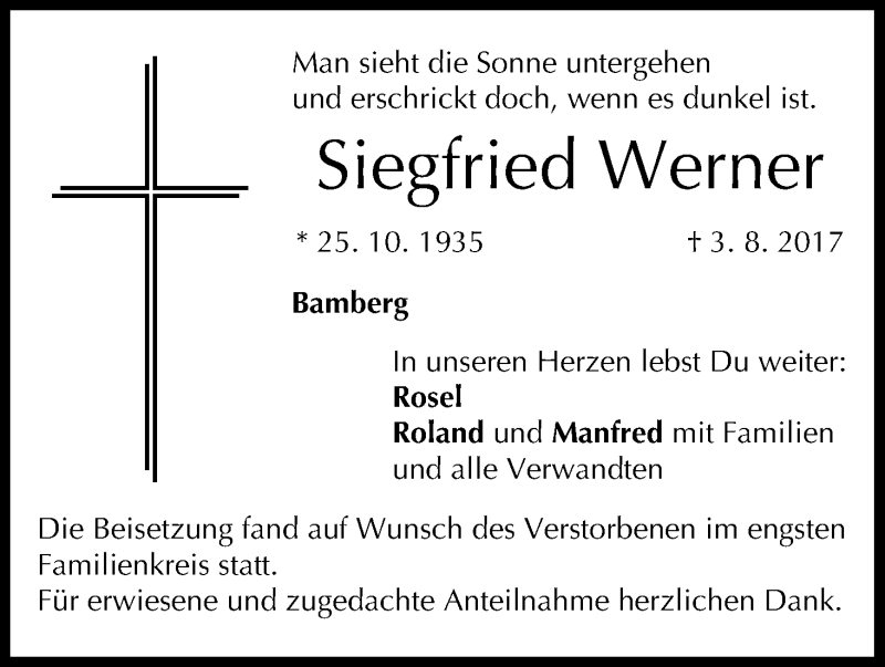 Hier finden Sie alle Traueranzeigen aus der Zeitung, die bisher für Siegfried Werner erschienen sind. Weitere Traueranzeigen, die in der Zeitung erscheinen, werden hier ebenfalls aufgelistet