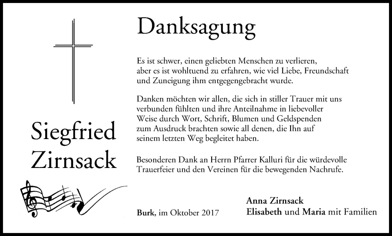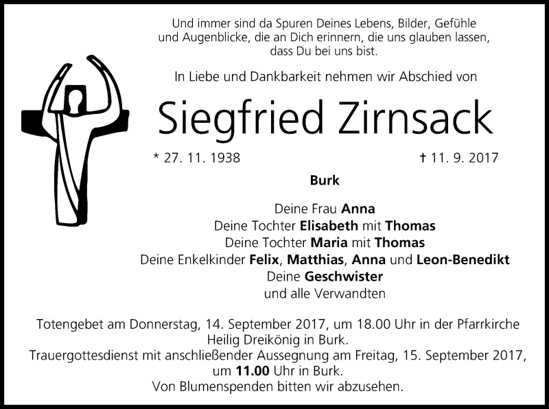 Hier finden Sie alle Traueranzeigen aus der Zeitung, die bisher für Siegfried Zirnsack erschienen sind. Weitere Traueranzeigen, die in der Zeitung erscheinen, werden hier ebenfalls aufgelistet